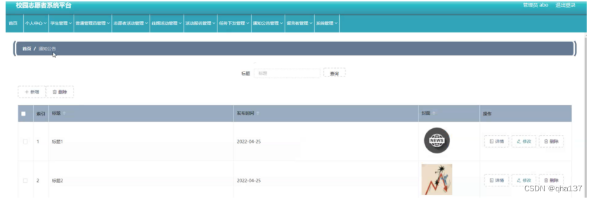 通知公告管理,在通知公告管理页面可以查看索引、标题、发布时间、封面等内容,进行详情或删除等操作,如图5-14所示。