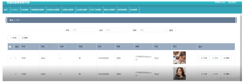 学生管理,在学生管理页面可以查看索引、学号、姓名、年龄、性别、手机、班级、邮箱、专业、照片等内容,并进行详情,修改或删除等操作,如图5-8所示。