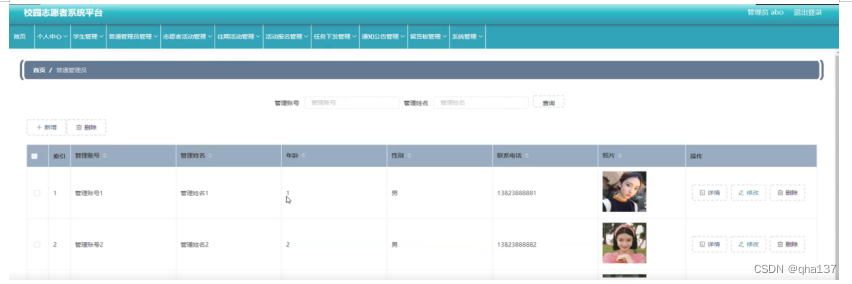 普通管理员管理,在普通管理员管理页面可以查看索引、管理账号、管理姓名、性别、年龄、联系电话、照片等内容,并进行详情,修改或删除等操作,如图5-9所示。