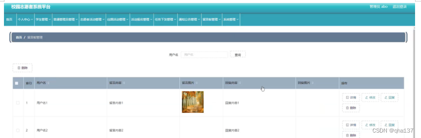 留言板管理,在留言板管理页面可以查看索引、用户名,留言内容,留言图片,回复内容,回复图片等内容进行详情,修改,回复和删除操作,如图5-15所示。