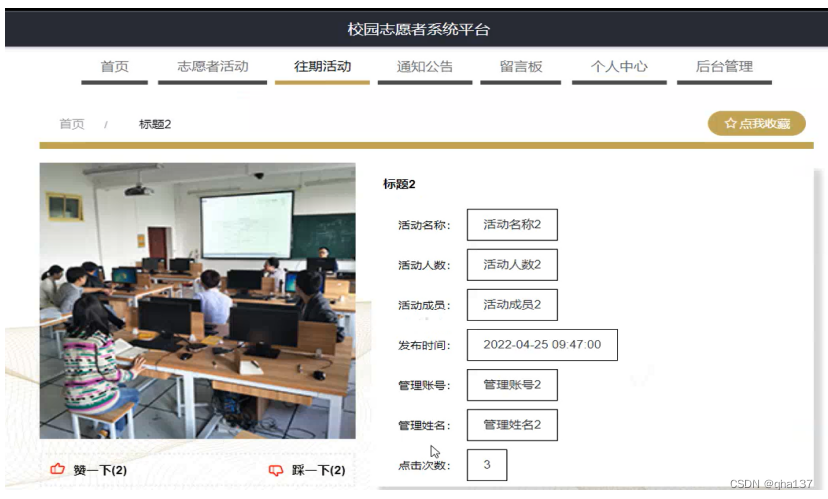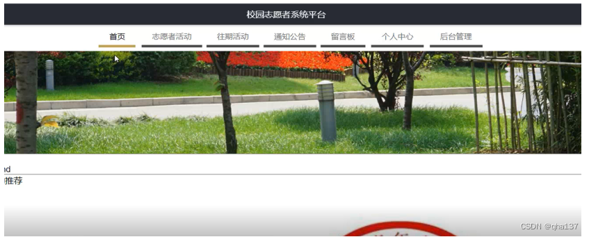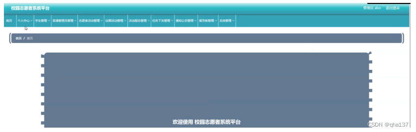 校园志愿者系统平台,在系统首页可以查看首页、志愿者活动、往期活动、通知公告、留言板、个人中心、后台管理等内容进行详细操作,如图5-3所示。