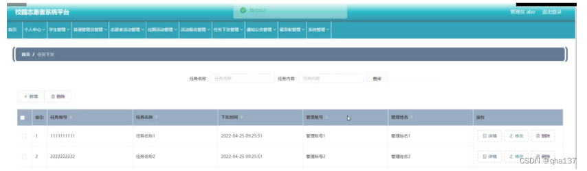 任务下发管理,在任务下发管理页面可以查看索引、认为编号,任务名称,下发时间,管理账号、管理姓名等内容进行详情,修改和删除操作,如图5-13所示。