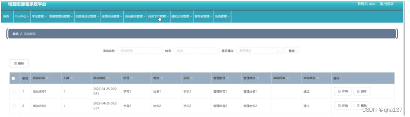 活动报名管理,在活动报名管理页面可以查看索引、活动名称、人数、报名时间、学号、姓名、手机、管理账号、管理姓名、审核回复、审核状态等内容,进行详情或删除等操作,如图5-12所示。