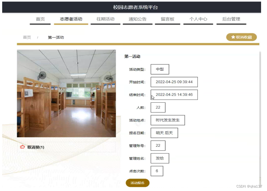 志愿者活动,在志愿者活动页面可以查看活动类型,开始时间,结束时间,人数,活动地点,报名日期,管理账号,管理姓名,点击次数等内容进行活动报名操作,如图5-4所示。