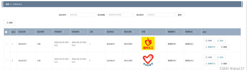 志愿者活动管理,在志愿者活动管理页面可以查看索引、活动名称、活动类型、开始时间、结束时间、人数、活动地点、报名日期、封面、管理账号、管理姓名等内容,并进行详情,修改,查看评论或删除等操作,如图5-10所示。
