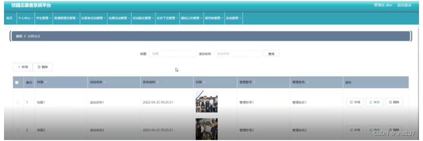 往期活动管理,在往期活动管理页面可以查看索引、标题、活动名称、发布时间、封面、管理账号、管理姓名等详细内容进行详情,修改和删除操作,如图5-11所示。