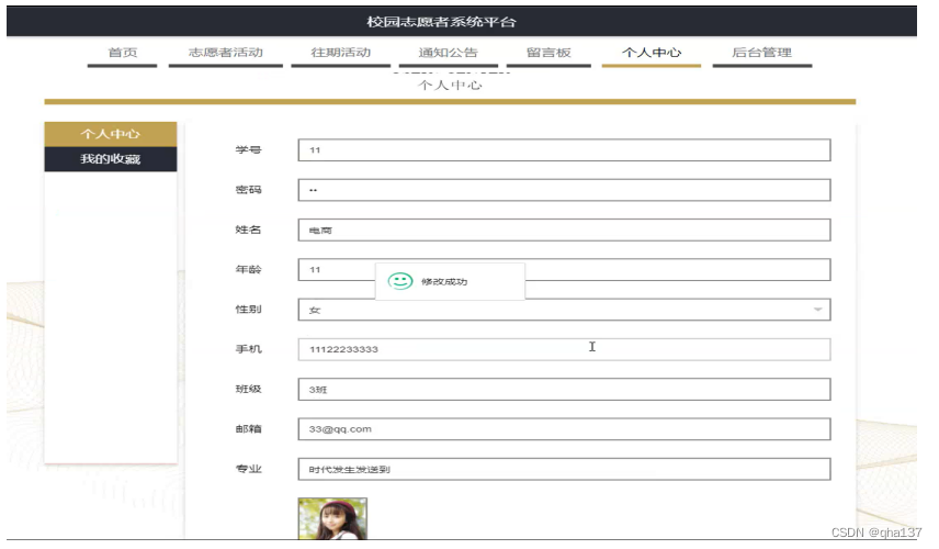 个人中心,在个人中心页面通过填写学号,密码,姓名年龄,性别,手机,班级,邮箱,专业,上传图片等内容进行更新信息操作,还可以对我的收藏进行详细操作;如图5-6所示。