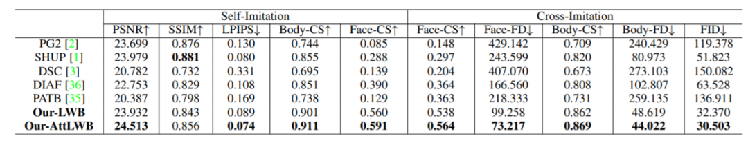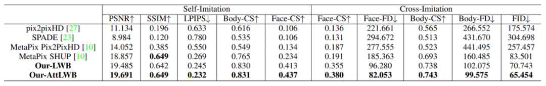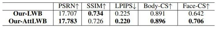 如表 3 所示:该研究在 iPER 数据集上,列出了对 LWB 以及 AttLWB 在外观迁移的结果,这里报告了 PSNR、SSIM、lpip, Body-CS 和 Face-CS。↑表示越大越好。更大的 SSIM 可能并不意味着图像质量更好[63]。
