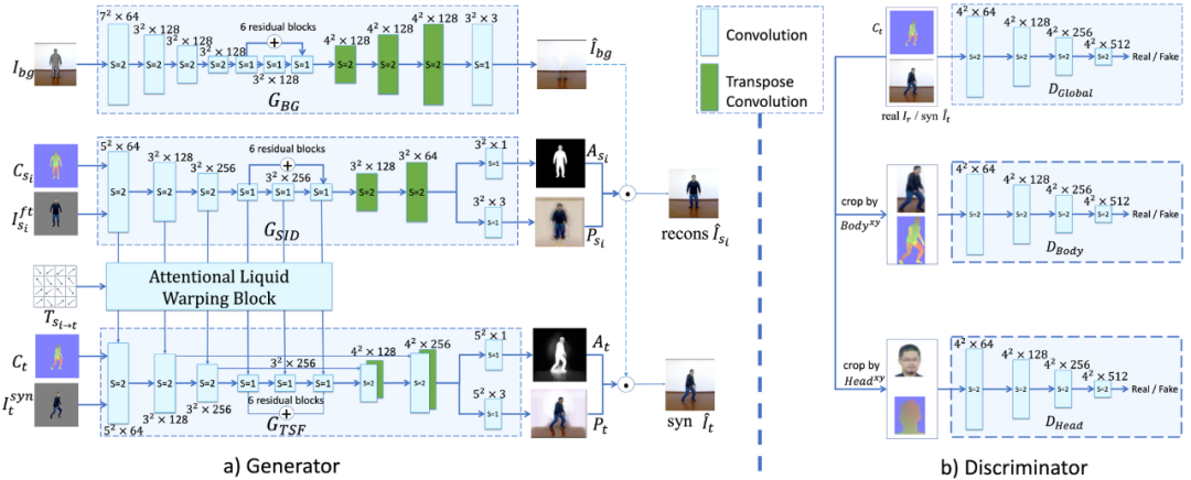 Attentional Liquid Warping GAN 网络架构的具体细节,包括生成器和鉴别器。其中 s 表示卷积和转置卷积中的步长(stride)大小。