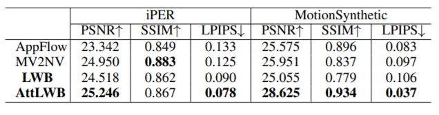 下表给出了在新视图合成任务上,基于 iPER 和 MotionSynthetic 数据集,几种方法的合成结果,包括 AppFlow、MV2NV、LWB 和 AttLWB,可以看到,新方法的 AttLWB 表现良好。