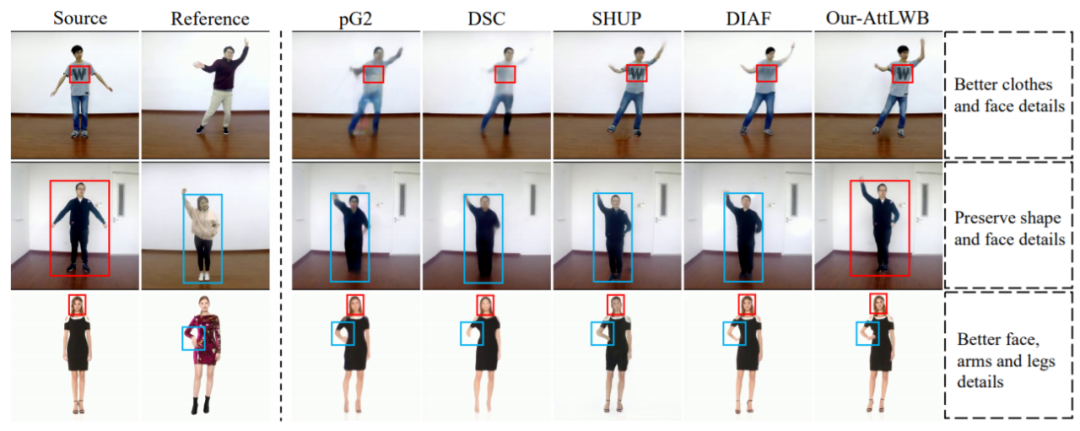 图 9:基于 iPER 和 FashionVideo 数据集,该方法与其他动作模仿合成方法的比较。所有结果的分辨率都为 512×512。用红色和蓝色矩形突出显示细节。
