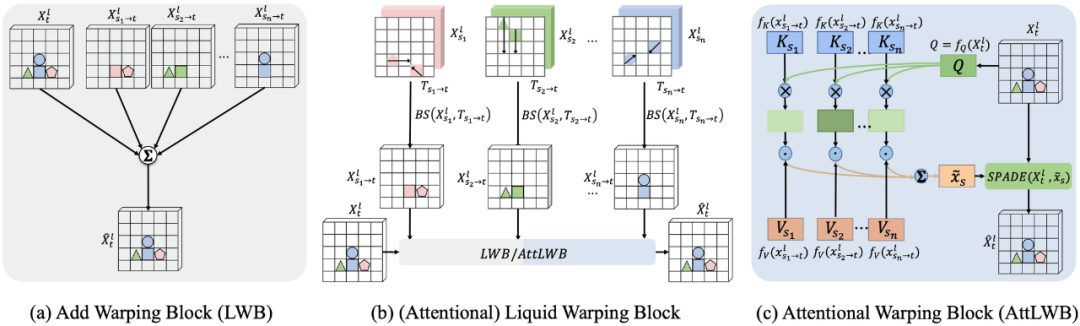 LWB 和 AttLWB 的结构。它们有如图(b)所示的相同结构。(a)是 AddWB 的结构,(b)是 (Attentional) Liquid Warping Block 的共有结构,(c) 是 AttWB 的架构。