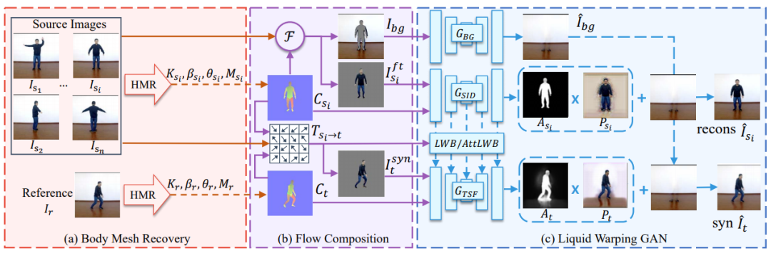 该方法包含 3 个部分:人体网格复原(body mesh recovery)、流组成(flow composition)、带有 Liquid Warping Block(LWB)或 Attentional Liquid Warping Block(AttLWB)的 GAN,如下图 3 所示: