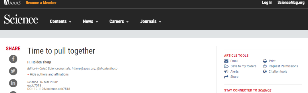 3月16日,Holden Thorp再次发文,以“Time to pull together”为题发出号召,他表示,很难想象未来世界在受到新冠病毒疫情的影响下将会发生什么,但我们应集中精力做好该做的。目前仍有很多有关新冠肺炎的医理问题、公共卫生和流行病学问题都还没有解决。