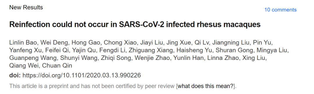 3月14日,一个驻中国团队在预印本网站发表了一篇论文,研究人员检查了两只从SARS-CoV-2轻度感染中恢复过来的猕猴,四周后再次将猴子暴露于病毒环境中,他们发现,猴子没有再次受到感染。