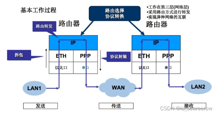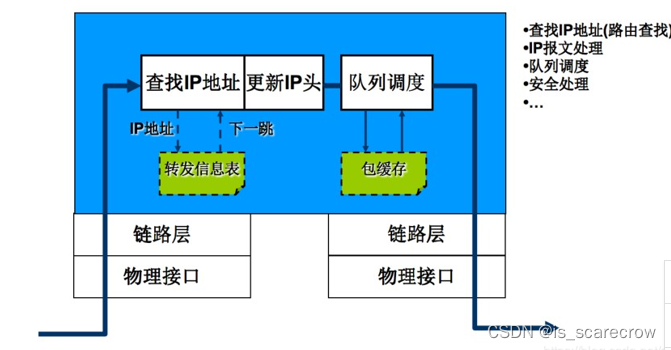 路由器收到数据包后,先将数据包根据OSI模型层层将数据包拆开,到网络层后根据IP进行路由转发(拿着IP地址通过转发信息表查找下一条得到对应的IP地址即路由查找,进行报文处理更新IP头部,通过包缓存完成队列的调度,安全处理……),根据接口协议层层封装,实现一种互联网落的互联。