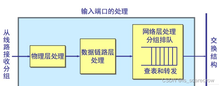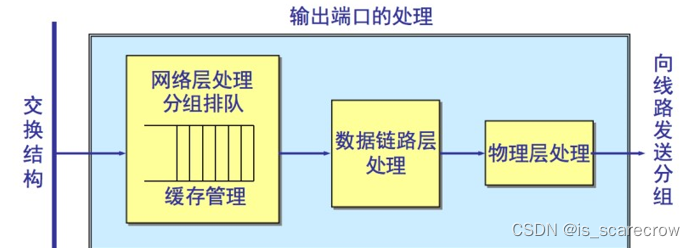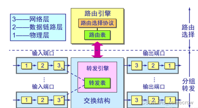 交换结构是一台路由器的核心组件,他的作用就是根据转发表对分组进行处理,将某个输入端口进入的分组从一个合适的输出端口转发出去。
