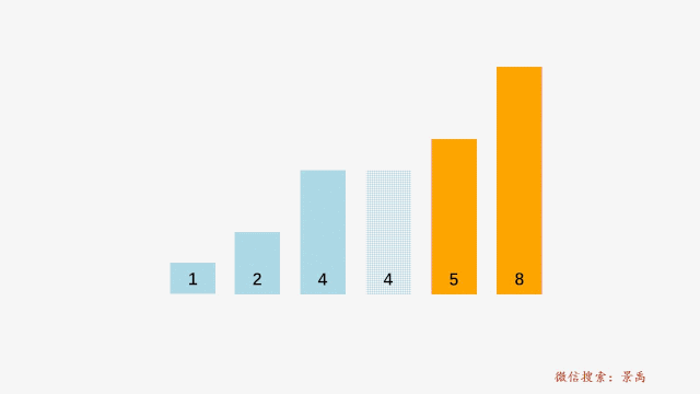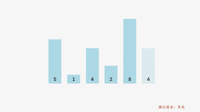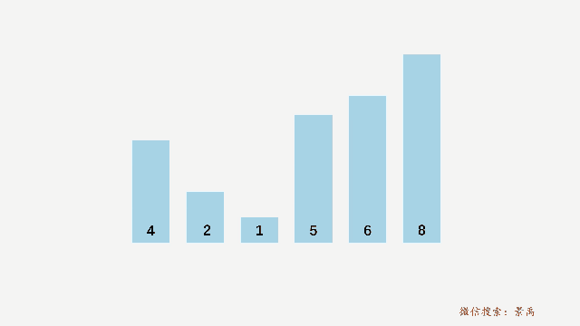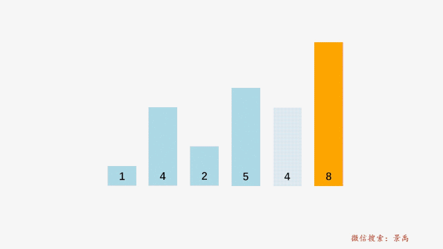 冒泡排序是最简单的排序算法了,简单到景禹不知如何更清晰地呈现(哈哈,开个玩笑)。冒泡排序通过不断地比较两个相邻元素,将较大的元素交换到右边(升序),从而实现排序。