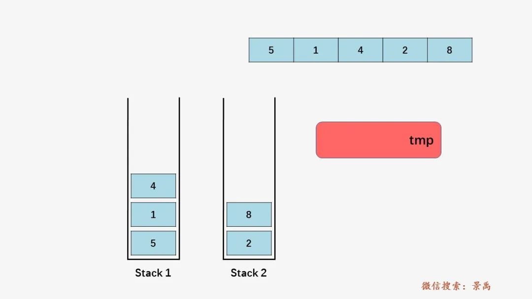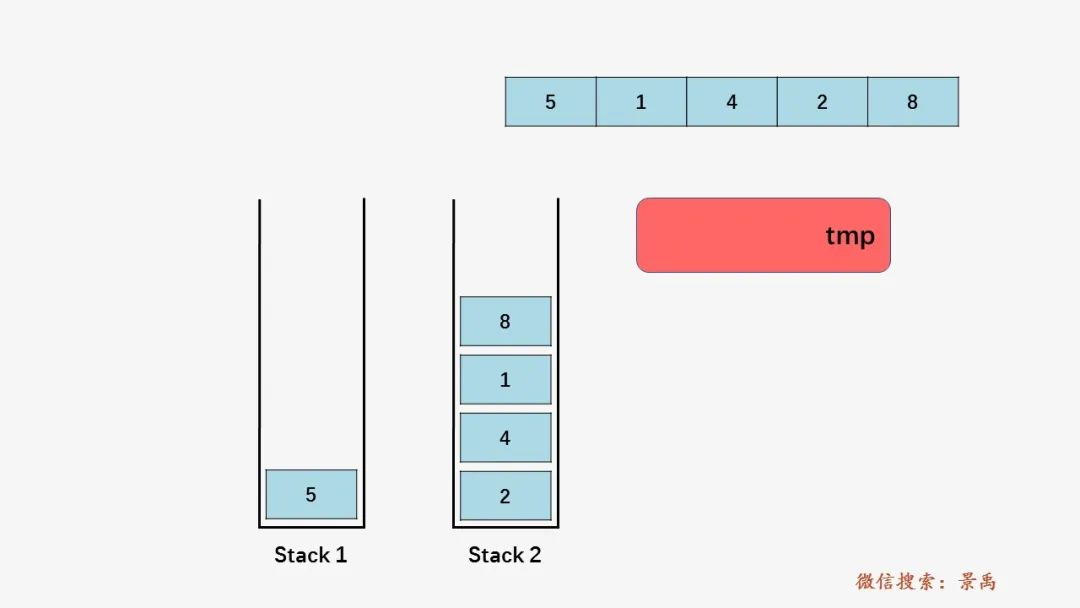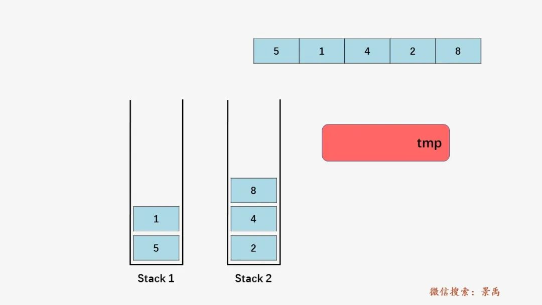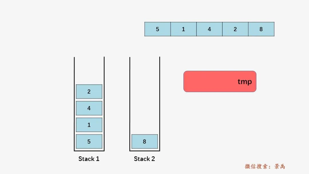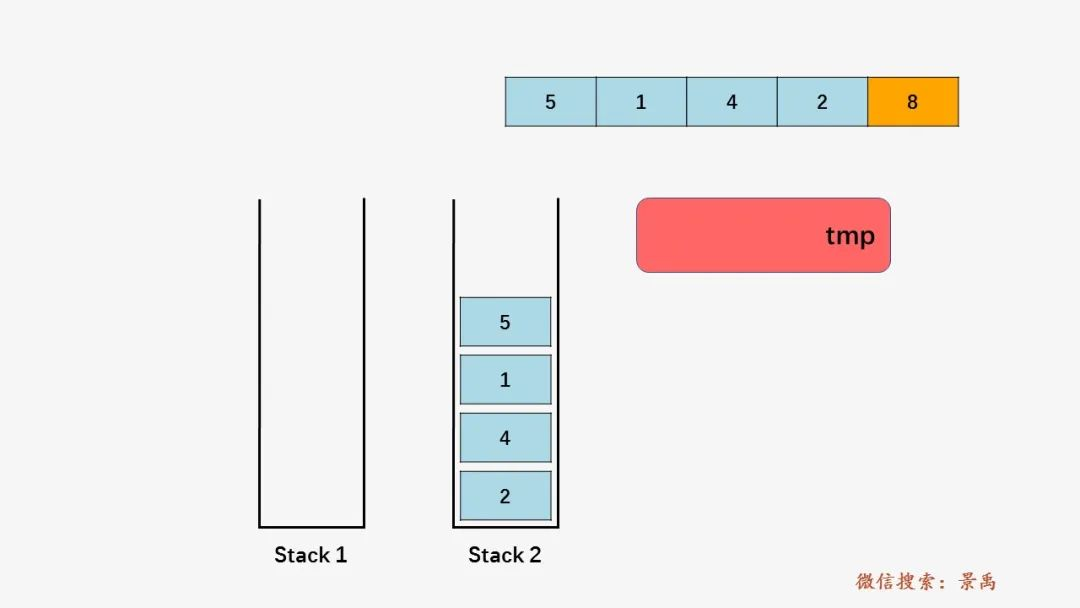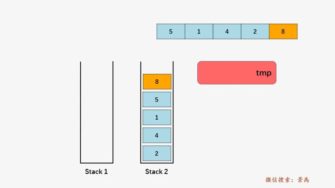 第三步:栈 s1 不为空,尝试将 s1 的栈顶元素 2 压入栈 s2 ,但是此时 s2 的栈顶元素 8 > 2,所以利用一个临时变量 tmp 交换两个元素在栈中的位置,先将 s2 的栈顶 8 保存到 tmp 并弹出,然后压入元素 2 ,最后再将 8 重新入栈。(其实就是交换操作)