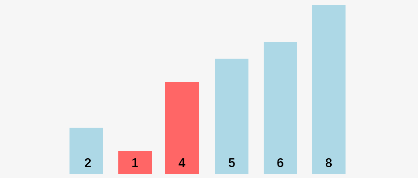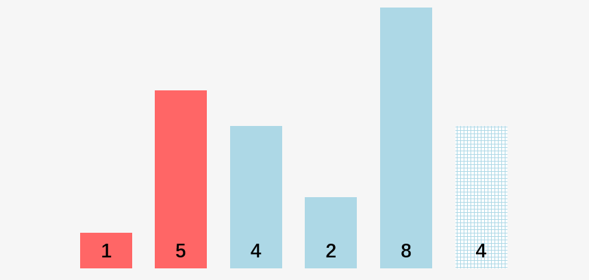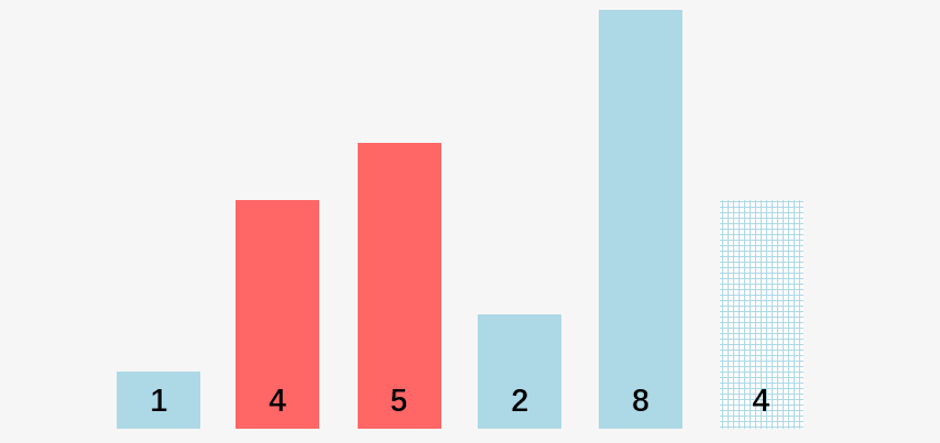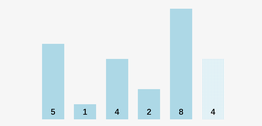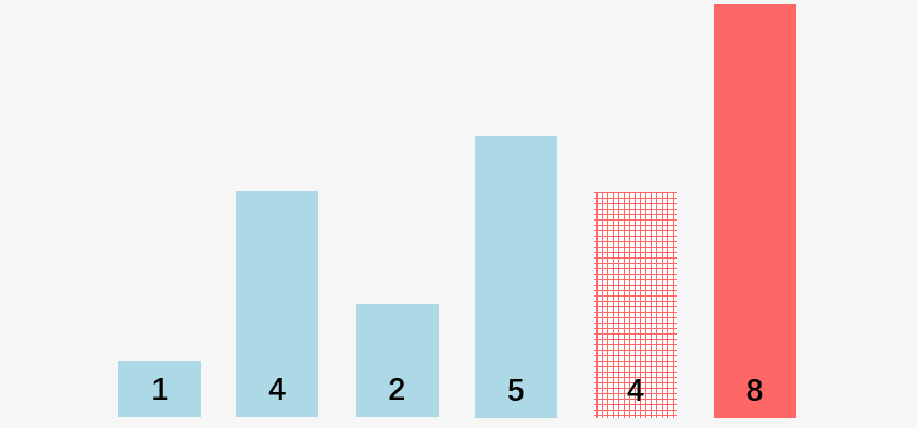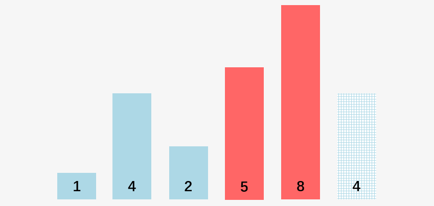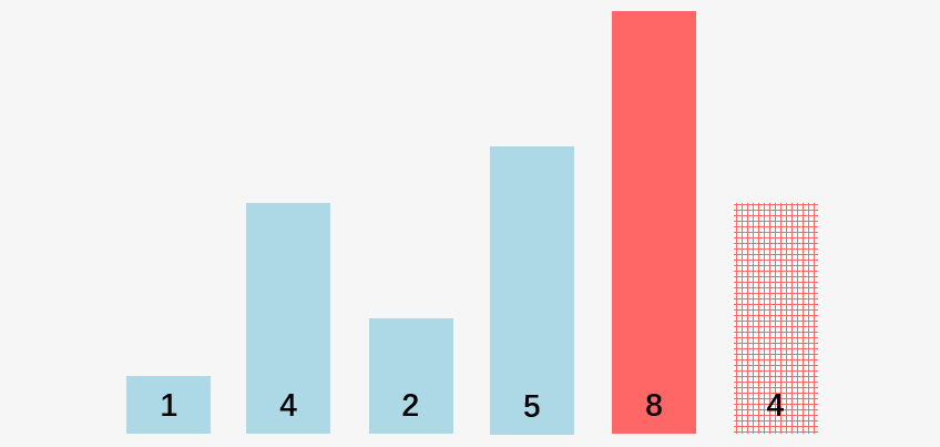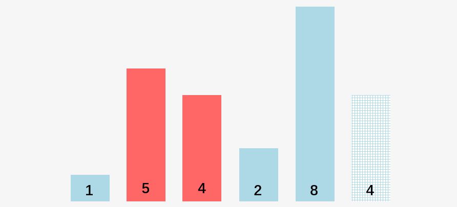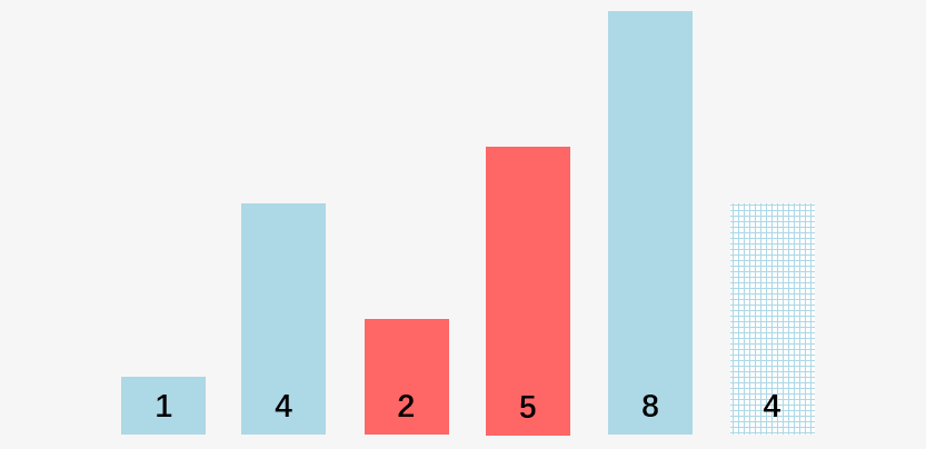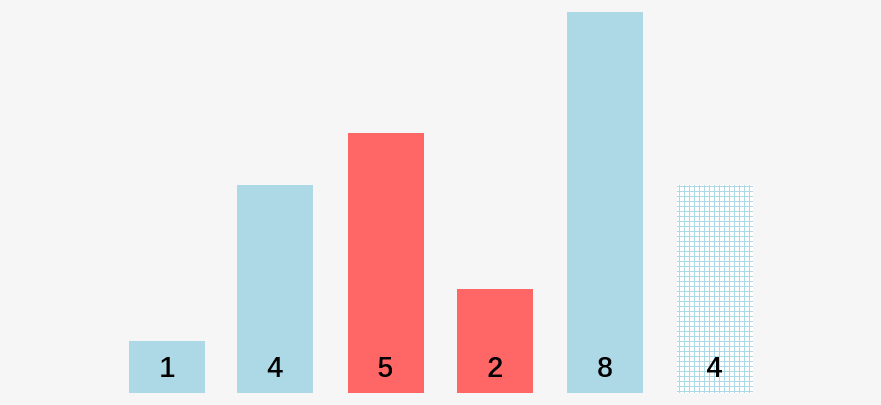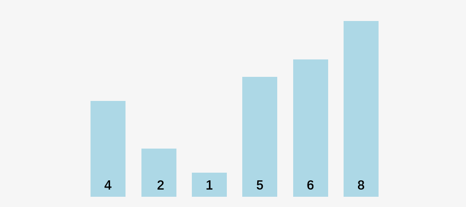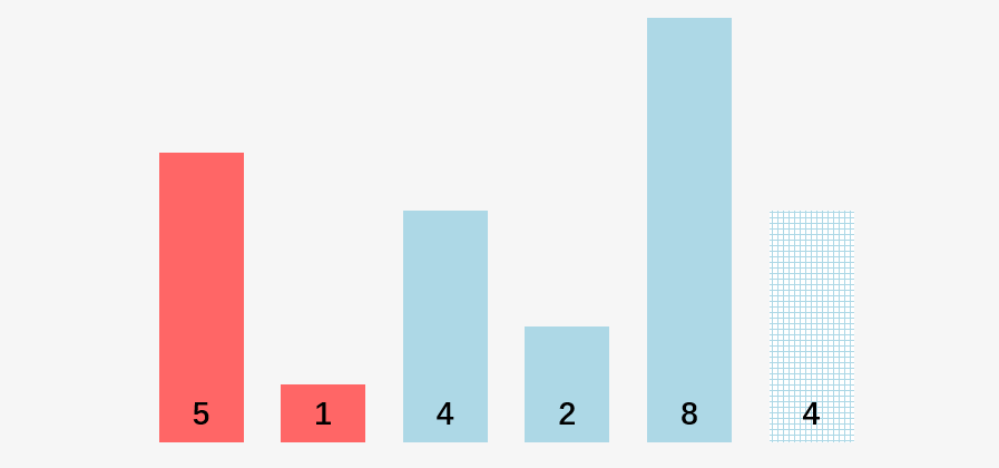 我们对数组 [5,1,4,2,8,4] ,采用冒泡排序进行排序,注意这里的两个 4 的纹理是不同的,主要是为了区分两个不同的 4 ,进而解释冒泡排序算法的稳定性问题。