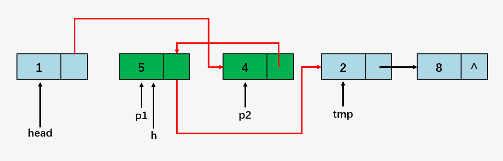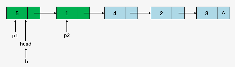 第二步:p1 = h ,p2 = p1->next ,比较 p1 和 p2 :