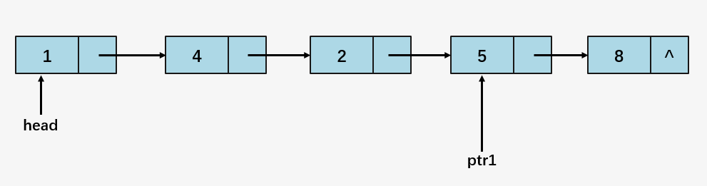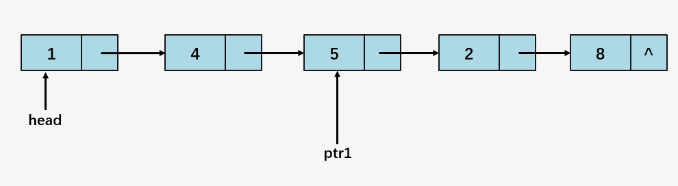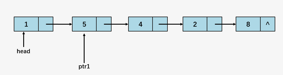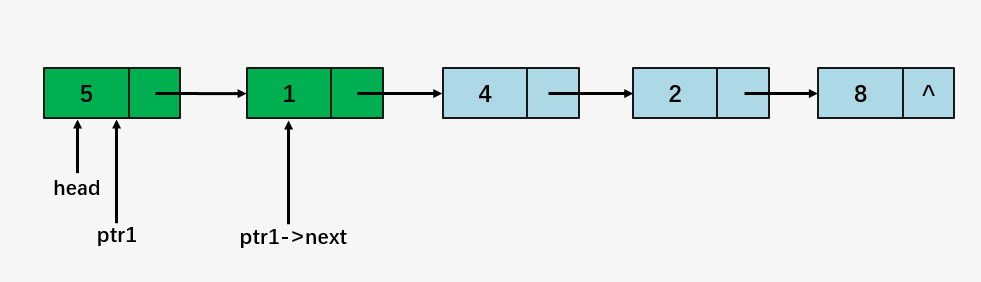 第一步:指针 ptr1 指向头结点 head ,ptr1->next 则指向了值为 1 的结点;