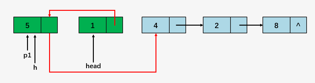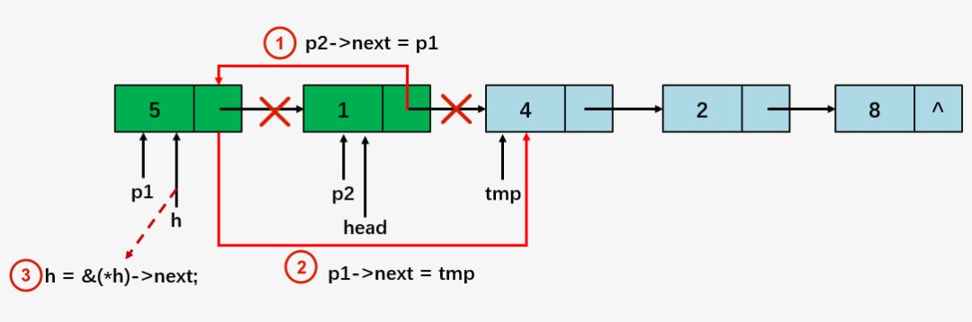 p2->next指向p1p1->next = p2h = &(*h)->nexthead = p2