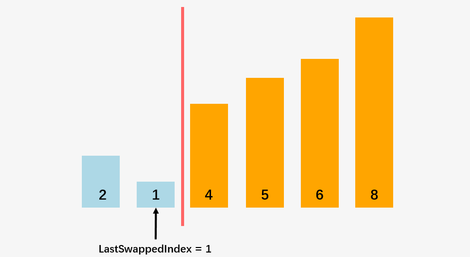 第一步:比较 2 和 1 ,2 > 1,交换,lastSwappedIndex = 0 ,并且第二趟冒泡也就结束了,也就说我们节省了 从 2 到 6的比较操作;