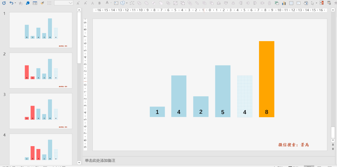 上面给各位盆友讲冒泡排序的 11 张图都是景禹在 PowerPoint (俗称PPT)中一张一张画的,不信你看: