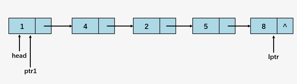 第五步:比较 5 和 8,5 < 8,不交换,ptr1 = ptr1 ->next ,然后用指针 lptr 指向 ptr1 ,再将 ptr1 = head 。