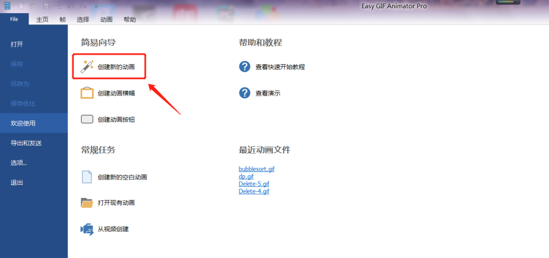 首先要把 PPT 中的每一页都保存成 jpg 或者 png 格式的图片,然后打开 Easy GIF Animator 点击 创建新的动画 :