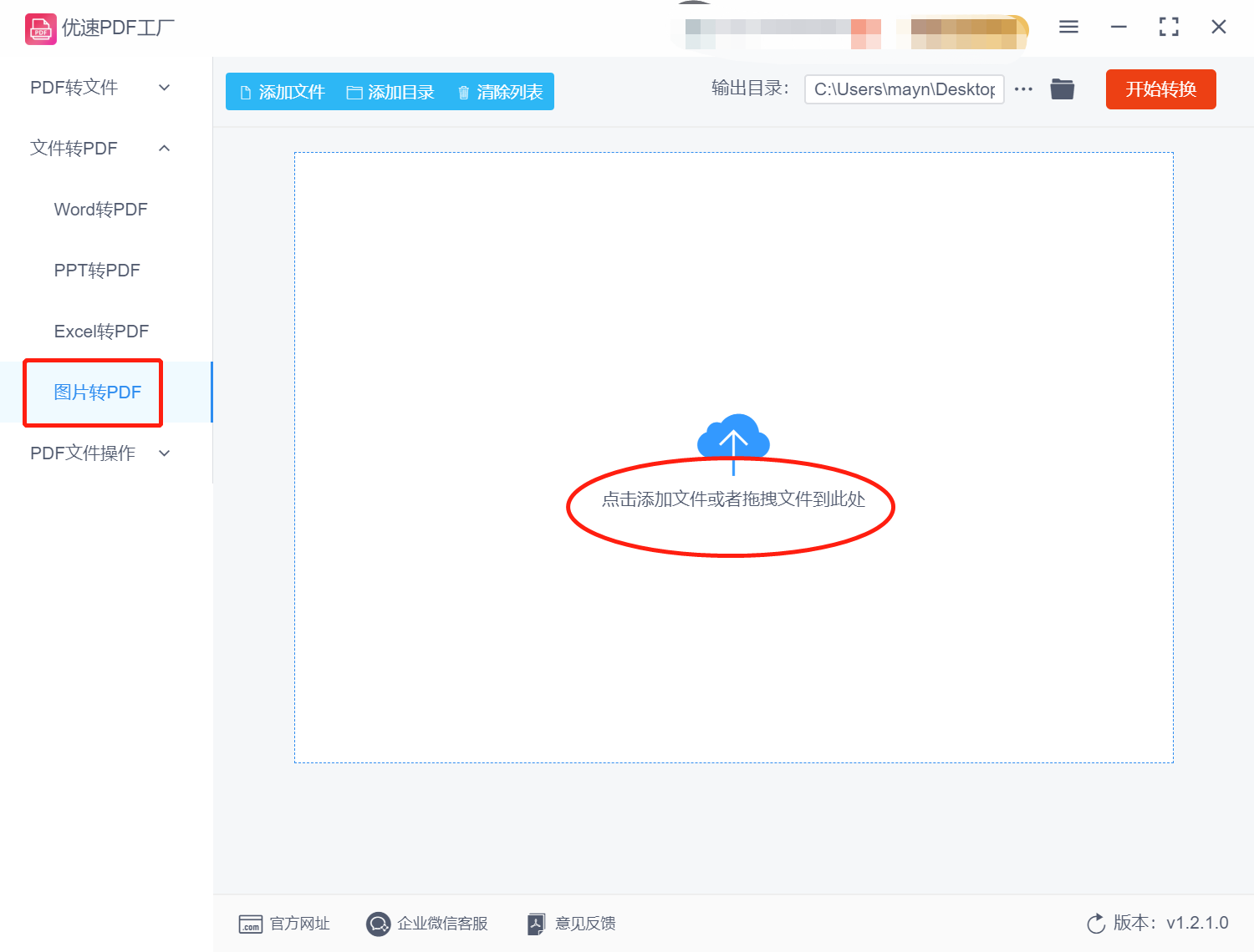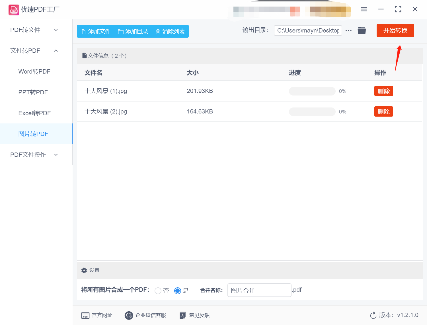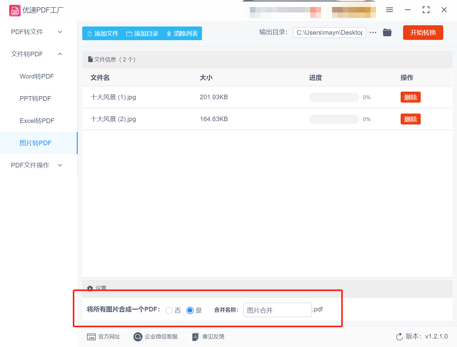 步骤4、设置输出目录文件夹,用来保存合并好的PDF文件。最后点击【开始转换】按钮,软件就会开始将图片合并成一个PDF文件,并在转换完成后自动打开输出文件夹,方便用户直接查看使用转换好的PDF文件。