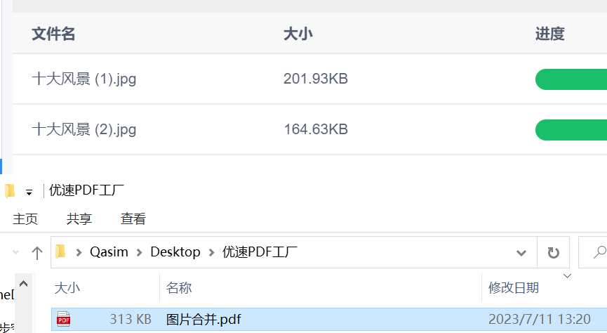 步骤5、检查输出文件夹,我们可以看到,软件成功的将上传的两张图片合并成了一个pdf文件,完成操作。