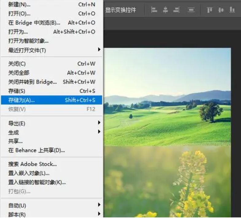 步骤3、点击Photoshop软件左上角的“文件”按钮,在对应的菜单栏中直接点击里面的“另存为”,将文件格式设置成pdf。