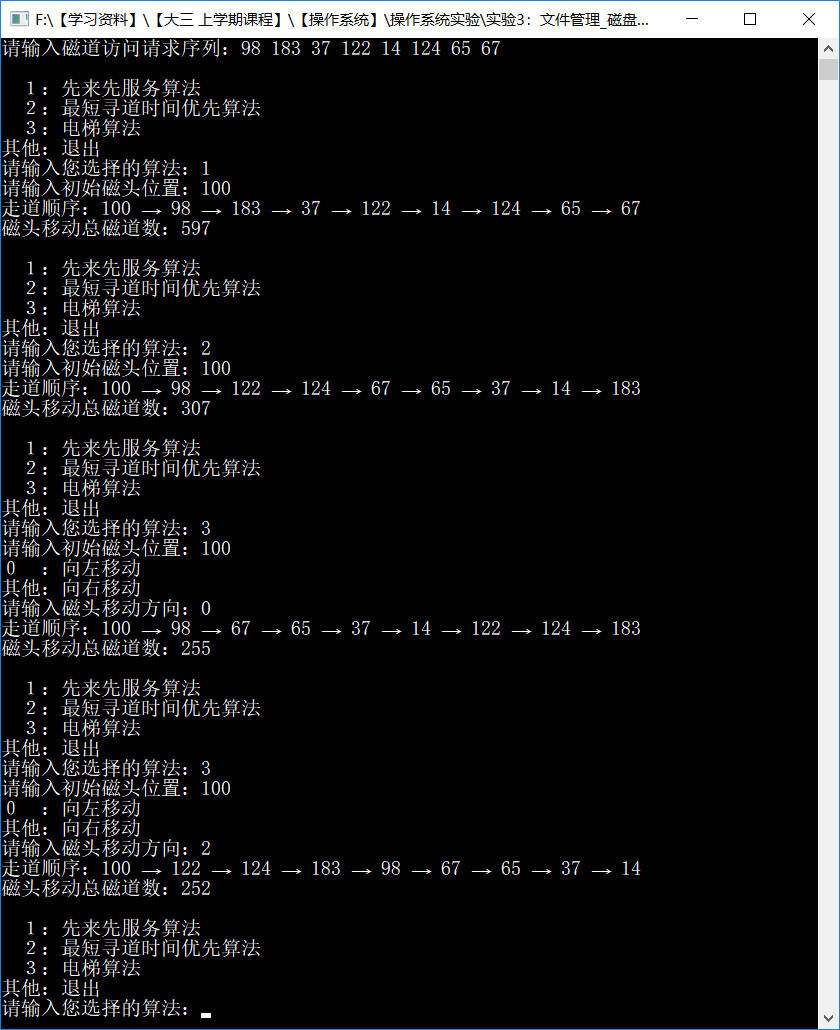 }int main() {cout << "请输入磁道访问请求序列:";for (int i = 0; i < trackNum; i++) {cin >> list[i].track;}cout << endl;while (1) {cout << " 1:先来先服务算法\n 2:最短寻道时间优先算法\n 3:电梯算法\n其他:退出" << endl;cout << "请输入您选择的算法:";int choose, start, direct;cin >> choose;if (choose != 1 && choose != 2 && choose != 3)break;cout << "请输入初始磁头位置:";cin >> start;switch (choose){case 1:FCFS(start);break;case 2:SSTF(start);break;case 3:cout << "0 :向左移动\n其他:向右移动\n请输入磁头移动方向:";cin >> direct;SCAN(start, direct);break;default:break;}}