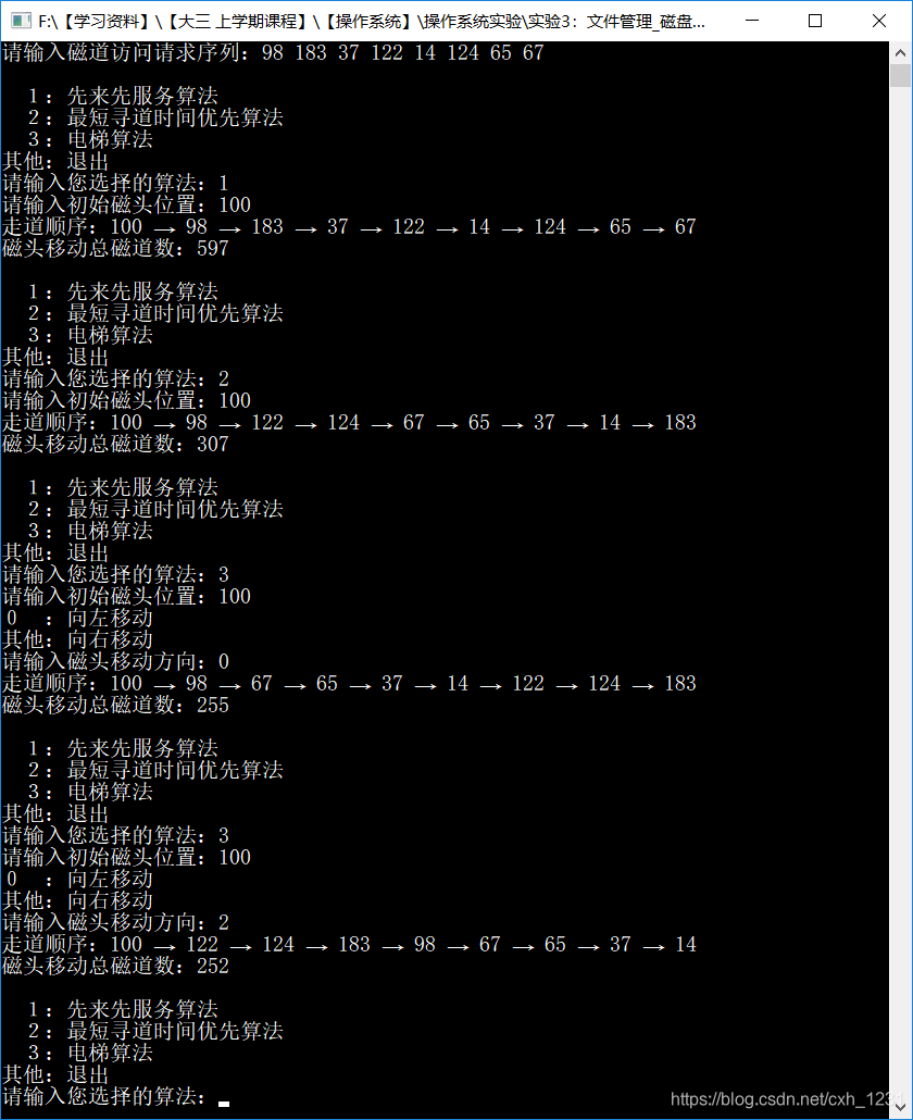 - –选择2~3种磁盘调度算法(先来先服务、最短寻道时间优先、电梯算法)模拟实现磁盘调度