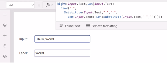 OutSystems 这个例子看起来还比较简单,但表达式语言也可以很复杂。微软是搞语言的行家,下图是个微软 Power Fx 的例子,这个表达式是要提取一个句子最后一个单词的表达式,也挺复杂吧(说实话我看了好大一阵子才看懂)。