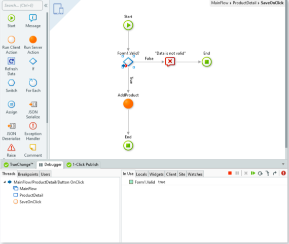 专业的低代码平台需要提供测试、debug、版本控制等软件工程支持。开发软件都会出 bug(低代码平台基本消除了语法层面的 bug,但对语义层面的 bug 一样无能为力),需求也总是会变。所以测试、debug、版本控制这些支持也是必不可少的。OutSystems 为什么做的最好,我觉得跟它完善的 debug 支持是分不开的。下图是 OutSystems 的 debug 界面,看起来和专业 IDE 有的一拼。