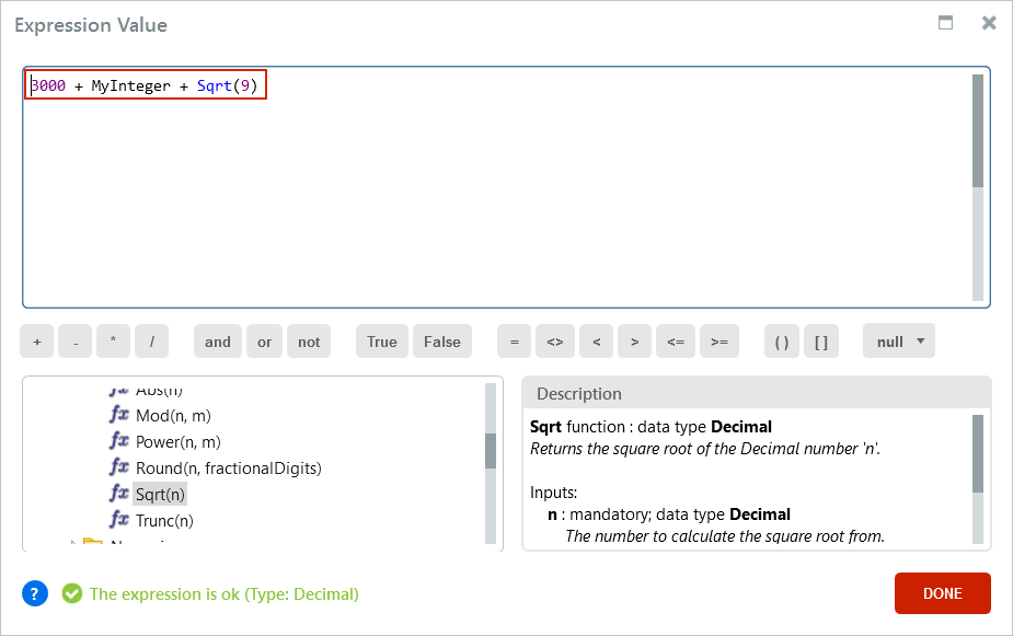 表达式语言有些类似 Excel 里的公式,有表达式语言才可以做一些比较复杂的计算。下图是 OutSystems 的表达式编辑器,大家可以看到有各种操作符,还有很多内置函数,比如数学函数、字符串处理函数等。