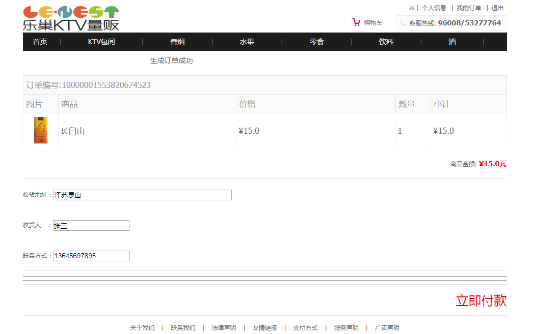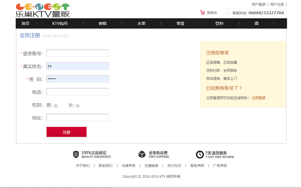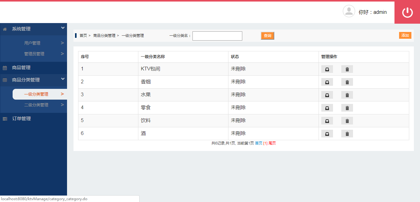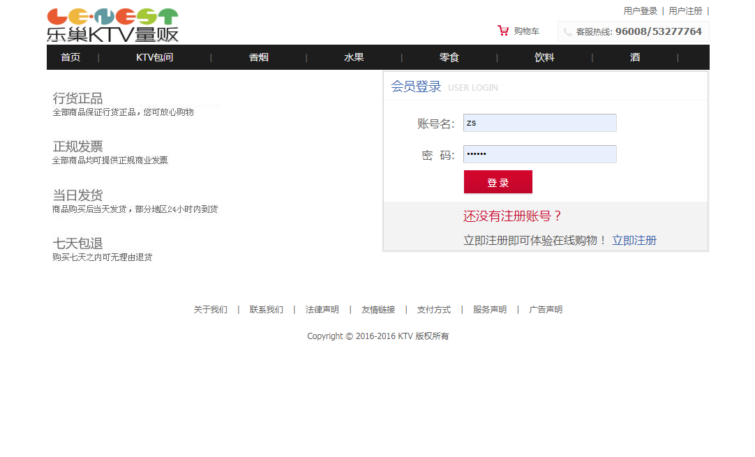 用户:可以注册、登录ktv消费系统;可以查看全部ktv包间,查看全部消费商品(香烟、水果、零食、饮料、酒),可以按分类和名称搜索包间和商品,可以查看包间和商品的详情;可以将ktv包间和商品加入购物车、可以下单付款;可以查看我的购物车,我的订单和个人信息。
