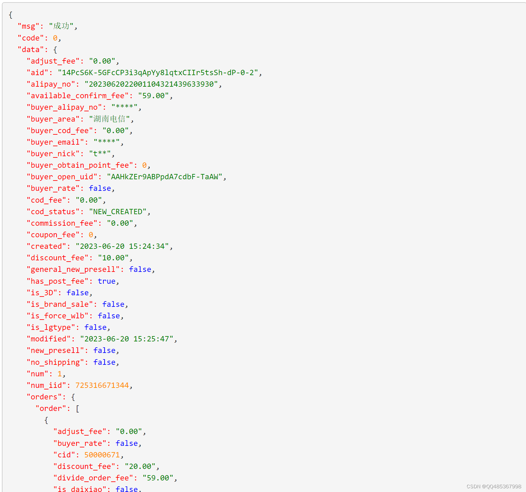 {"msg": "成功","code": 0,"data": {"adjust_fee": "0.00","aid": "14PcS6K-5GFcCP3i3qApYy8lqtxCIIr5tsSh-dP-0-2","alipay_no": "2023062022001104321439633930","available_confirm_fee": "59.00","buyer_alipay_no": "****","buyer_area": "湖南电信","buyer_cod_fee": "0.00","buyer_email": "****","buyer_nick": "t**","buyer_obtain_point_fee": 0,"buyer_open_uid": "AAHkZEr9ABPpdA7cdbF-TaAW","buyer_rate": false,"cod_fee": "0.00","cod_status": "NEW_CREATED","commission_fee": "0.00","coupon_fee": 0,"created": "2023-06-20 15:24:34","discount_fee": "10.00","general_new_presell": false,"has_post_fee": true,"is_3D": false,"is_brand_sale": false,"is_force_wlb": false,"is_lgtype": false,"modified": "2023-06-20 15:25:47","new_presell": false,"no_shipping": false,"num": 1,"num_iid": 725316671344,"orders": {"order": [{"adjust_fee": "0.00","buyer_rate": false,"cid": 50000671,"discount_fee": "20.00","divide_order_fee": "59.00","is_daixiao": false,"is_idle": "0","is_oversold": false,"nr_outer_iid": "KKC-1楼-118-B-1581","num": 1,"num_iid": 725316671344,"oid": "1919139963937821165","oid_str": "1919139963937821165","order_from": "WAP,WAP","outer_iid": "KKC-1楼-118-B-1581","outer_sku_id": "KKC-1楼-118-B-1581-红色上衣-M","part_mjz_discount": "10.00","payment": "59.00","pic_path": "https://img.alicdn.com/bao/uploaded/i1/4043104216/O1CN014Og79w1h0yfGtqfy1_!!4043104216.jpg","price": "89.00","refund_status": "NO_REFUND","seller_rate": false,"seller_type": "B","sku_id": "5208343199724","sku_properties_name": "主要颜色:红色【女装/2023新款/设计感小众/衣服/情侣装/甜辣/夏季/正肩/女士/体恤/女装/夏装/今年流行的/搭配】;尺码:M[推荐100-110斤]","snapshot_url": "w:1919139963937821165_1","status": "WAIT_SELLER_SEND_GOODS","title": "美式红色露背正肩短袖t恤女夏季短款辣妹修身紧身无袖小飞袖上衣","total_fee": "69.00"}]},"pay_time": "2023-06-20 15:24:38","payment": "59.00","pic_path": "https://img.alicdn.com/bao/uploaded/i1/4043104216/O1CN014Og79w1h0yfGtqfy1_!!4043104216.jpg","point_fee": 0,"post_fee": "0.00","price": "89.00","real_point_fee": 0,"received_payment": "0.00","receiver_address": "南*街道金洲大涌**广场***号骏发汽车划痕快修","receiver_city": "广州市","receiver_district": "南沙区","receiver_mobile": "*******1573","receiver_name": "李**","receiver_state": "广东省","receiver_zip": "000000","seller_alipay_no": "***channvzhuang@163.com","seller_cod_fee": "0.00","seller_email": "www.979799533@qq.com","seller_flag": 4,"seller_memo": "礼品","seller_mobile": "15915569594","seller_name": "广州三七二一商贸有限公司","seller_nick": "辉婵旗舰店","seller_rate": false,"shipping_type": "express","snapshot_url": "w:1919139963937821165_1","status": "WAIT_SELLER_SEND_GOODS","tid": "1919139963937821165","tid_str": "1919139963937821165","title": "辉婵旗舰店","total_fee": "89.00","trade_from": "WAP,WAP","type": "fixed","you_xiang": false}
