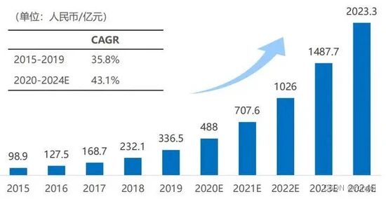 根据光云科技招股书及36氪研究院数据显示,2015-2019年,电商SaaS市场规模有98.9亿高速增长至336.5亿元,年复合增长率达35.8%,预计2024年电商SaaS市场规模将突破2000亿元,2021-2024年复合增长率约为42%。