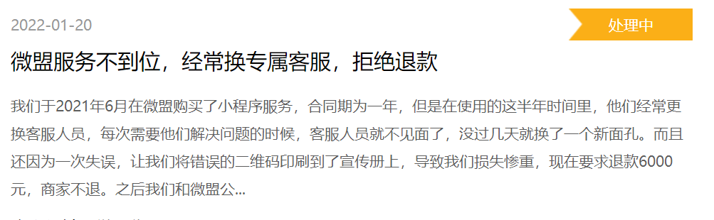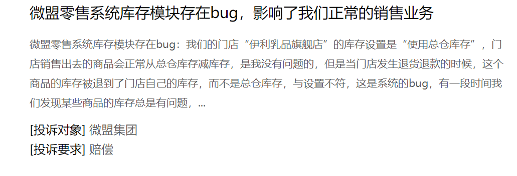 根据黑猫投诉内容显示,“一位用户在使用微盟零售系统库存模块存在Bug,计算总仓库存会与设置不符影响公司的正常销售业绩;此外,还有用户在表示微盟服务不到位,经常换专属客户导致公司损失。”