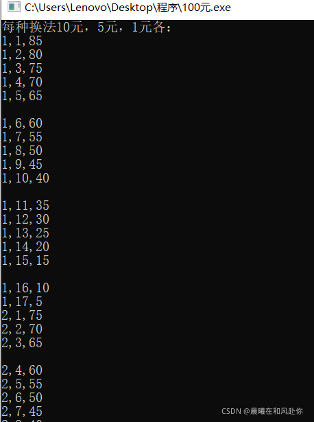 {int a,b,c,count=0;printf("每种换法10元,5元,1元各:\n");for(a=1;a<=9;a++){for(b=1;b<=17;b++){for(c=1;c<=85;c++){if(a*10+b*5+c==100){count++; printf("%d,%d,%d\n",a,b,c);if(count%5==0) printf("\n");}}}} printf("共有%d换法\n",count);return 0;}