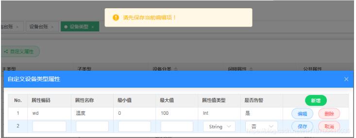 | <template> <el-dialog class="uiot-dialog" width="900px" :visible.sync="isShow" :before-close="beforeClose" :close-on-click-modal="false" :title="$t('basicData.device.propDlg.dlgTitle')" @open="open"> <el-table :data="propTableData.col.filter(data => handleAdd || data.name.toLowerCase().includes(handleAdd.toLowerCase()))" highlight-current-row border> <el-table-column label="No." type="index" align="center" width="50">el-table-column> <el-table-column :label="$t('basicData.device.propDlg.code')"> <template slot-scope="scope"> <span v-if="scope.row.isSet"> <el-input size="mini" v-model="scope.row.code">el-input> span> <span v-else>{{ scope.row.code }}span> template> el-table-column> <el-table-column :label="$t('basicData.device.propDlg.name')"> <template slot-scope="scope"> <span v-if="scope.row.isSet"> <el-input size="mini" v-model="scope.row.name">el-input> span> <span v-else>{{ scope.row.name }}span> template> el-table-column> <el-table-column :label="$t('basicData.device.propDlg.minValue')"> <template slot-scope="scope"> <span v-if="scope.row.isSet"> <el-input size="mini" v-model="scope.row.minValue">el-input> span> <span v-else>{{ scope.row.minValue }}span> template> el-table-column> <el-table-column :label="$t('basicData.device.propDlg.maxValue')"> <template slot-scope="scope"> <span v-if="scope.row.isSet"> <el-input size="mini" v-model="scope.row.maxValue">el-input> span> <span v-else>{{ scope.row.maxValue }}span> template> el-table-column> <el-table-column :label="$t('basicData.device.propDlg.valueType')"> <template slot-scope="scope"> <span v-if="scope.row.isSet"> <el-select size="mini" v-model="scope.row.valueType" :placeholder="$t('common.pleSelect')"> <el-option v-for="item in valTypeOptions" :key="item.value" :label="item.label" :value="item.value">el-option> el-select> span> <span v-else>{{ scope.row.valueType }}span> template> el-table-column> <el-table-column :label="$t('basicData.device.propDlg.warning')"> <template slot-scope="scope"> <span v-if="scope.row.isSet"> <el-select v-model="scope.row.warning" size="mini"> <el-option v-for="item in warnOptions" :key="item.value" :label="item.label" :value="item.value">el-option> el-select> span> <span v-else>{{ scope.row.warning===true?'是':'否' }}span> template> el-table-column> <el-table-column align="center" width="170px"> <template slot="header" slot-scope="scope"> <el-button v-model="handleAdd" size="mini" type="success" round plain @click="handleAdd(scope.$index, scope.row)">{{ $t('common.add') }}el-button> template> <template slot-scope="scope"> <el-button size="mini" type="primary" round plain v-if="!scope.row.isSet" @click="valChange(scope.row,scope.$index,true)">{{ $t('common.edit') }}el-button> <el-button size="mini" type="primary" round plain v-else @click="valChange(scope.row,scope.$index,true)">{{ $t('common.save') }}el-button> <el-button size="mini" type="danger" round plain v-if="!scope.row.isSet" @click="handleDelete(scope.$index, scope.row)">{{ $t('common.delete') }}el-button> <el-button size="mini" type="danger" round plain v-else @click="valChange(scope.row,scope.$index,false)">{{ $t('common.cancel') }}el-button> template> el-table-column> el-table> el-dialog> template> <script> import { open } from 'fs' import '@/styles/uiot.scss' const defaultProp = { code: '', maxValue: '', minValue: '', name: '', valueType: 'String', id: '', typeId: '', warning: false } export default { props: { isShow: Boolean, oneRow: { type: Array, default: function() { return defaultProp } } }, data() { return { propTableData: { sel: null, // 选中行 col: [] }, warnOptions: [ { value: true, label: '是' }, { value: false, label: '否' } ], valTypeOptions: [ { value: 'String', label: 'String' }, { value: 'Int', label: 'Int' }, { value: 'Double', label: 'Double' }, { value: 'Boolean', label: 'Boolean' }, { value: 'Date', label: 'Date' } ] } }, created() {}, methods: { open() { this.propTableData.col = this.oneRow this.propTableData.col.map(i => { i.isSet = false }) console.log('open', this.propTableData.col) }, // 添加 handleAdd() { for (let i of this.propTableData.col) { if (i.isSet) { return this.Message( this.$t('basicData.device.propDlg.pleSave'), 'warning' ) } } let row = { code: '', maxValue: '', minValue: '', name: '', valueType: 'String', id: '', typeId: '', warning: false, isSet: true } this.propTableData.col.push(row) this.propTableData.sel = row }, //修改 valChange(row, index, qx) { console.log('edit', this.propTableData) //点击修改,判断是否已经保存所有操作 for (let i of this.propTableData.col) { console.log('i.isSet', i.isSet, i.id, row.id) if (i.isSet && i.id != row.id) { this.Message(this.$t('basicData.device.propDlg.pleSave'), 'warning') return false } } //是否是取消操作 if (!qx) { console.log('qx', this.propTableData.sel.id) if (!this.propTableData.sel.id) { this.propTableData.col.splice(index, 1) } return (row.isSet = !row.isSet) } //提交数据 if (row.isSet) { console.log('this.propTableData.sel', this.propTableData.sel) const v = this.propTableData.sel // 必填项判断 if (v.code == '' || v.name == '') { this.Message(this.$t('common.pleEnter'), 'warning') } else { this.$emit('confirm', this.propTableData.sel) row.isSet = false } } else { this.propTableData.sel = row row.isSet = true } }, // 删除 handleDelete(index, row) { this.$emit('delete', row.id) }, beforeClose() { this.$emit('cancel') }, Message(msg, type) { this.$message({ type: type ? type : 'info', message: msg }) } } } script> <style lang="scss"> style> |