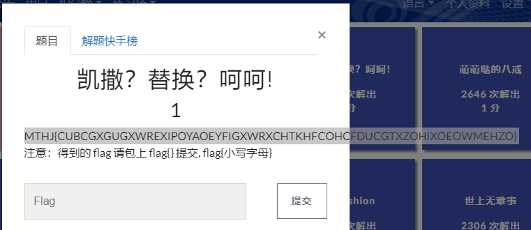STEP1:根据题目容易用凯撒密码对密文MTHJ{CUBCGXGUGXWREXIPOYAOEYFIGXWRXCHTKHFCOHCFDUCGTXZOHIXOEOWMEHZO} 进行暴力破解,但是结果没有相符合的。