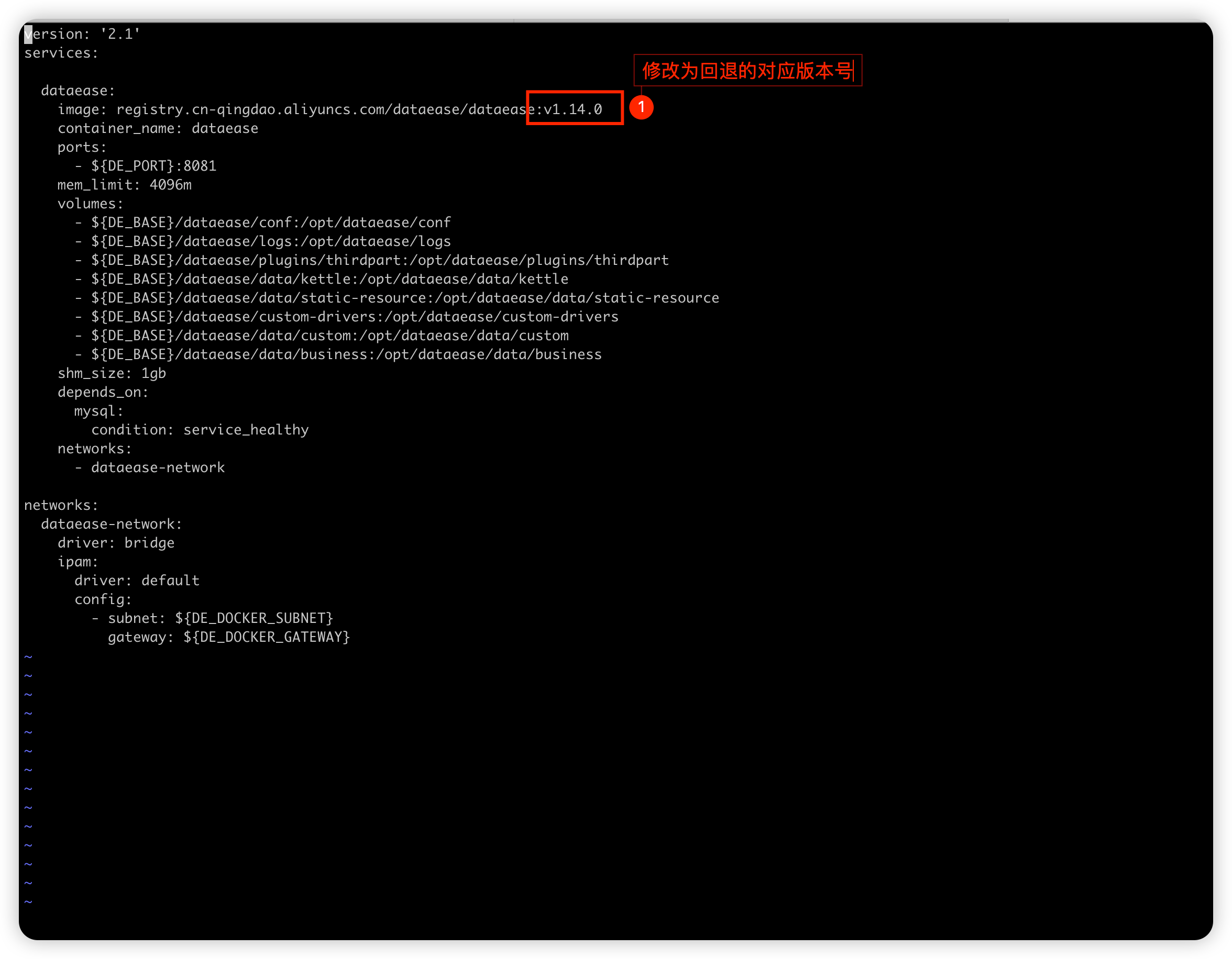 查看 docker-compos.yml 对应的版本号是否未本次回退的版本号,如果涉及其它服务回退版本,依次修改其它配置文件的对应版本号
