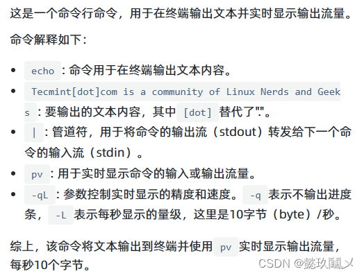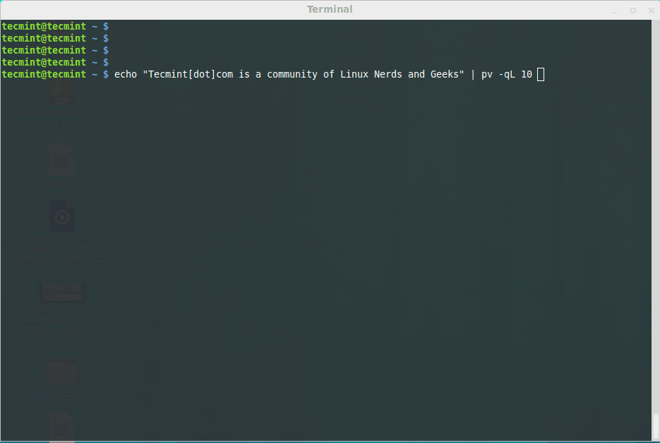 $ echo "Tecmint[dot]com is a community of Linux Nerds and Geeks" | pv -qL 10