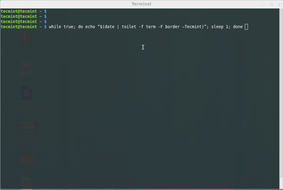 $ while true; do echo “$(date | toilet -f term -F border –Tecmint)”; sleep 1; done