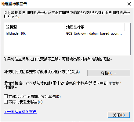 加载文件夹中的图层数据:省会城市、地级市驻地、主要公路、国界线、省级行政区、Hillshade_10k。确定后如果会弹出下图的对话框,直接关闭就好了。